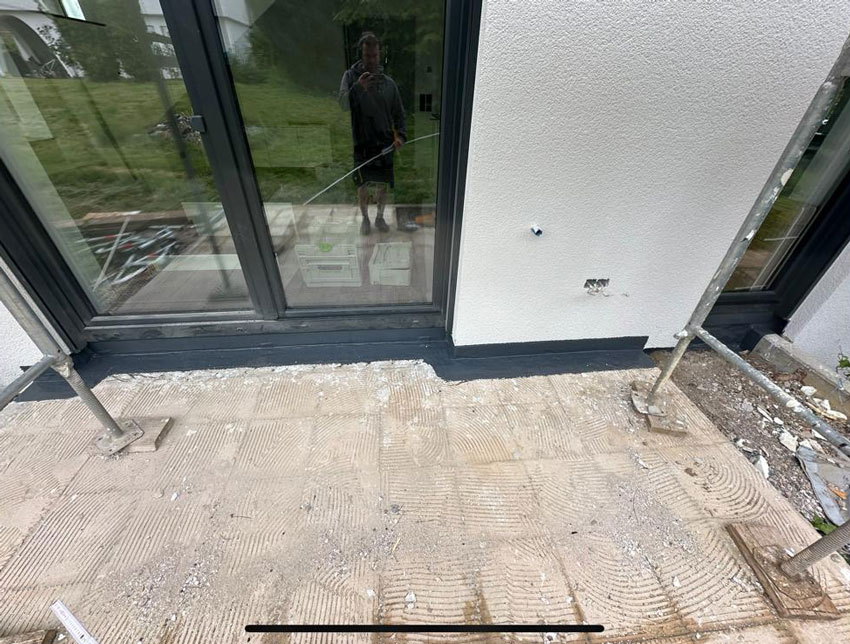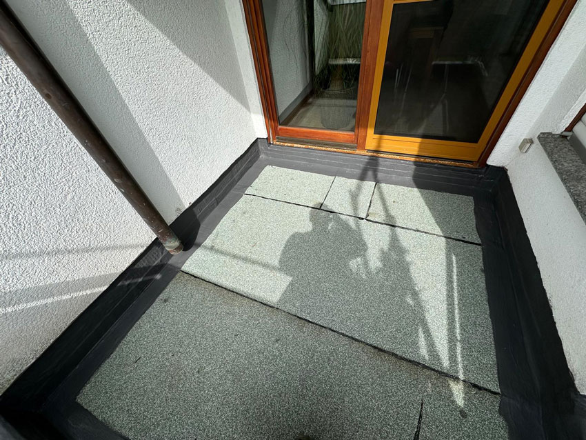 Der Bodenbelag von Balkonen oder Terrassen besteht in der Regel aus Fliesen bzw. Platten. Diese werden inklusive Abdichtung entfernt. Die Neigung und der Gefälleestrich werden kontrolliert und ggf. erneuert. Sind Unterkonstruktion und Estrich in Ordnung, wird die Oberfläche neu grundiert.
