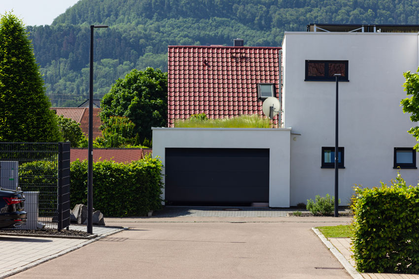 Ein Garagendach kann, wenn es als Flachdach konzipiert ist, eine von oben sichtbare Abdichtung ohne darüber liegende Schicht erhalten oder alternativ mit Abdichtung plus Kiesschicht bzw. als Gründach ausgebildet werden.